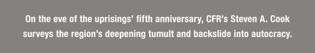Five years after the world watched the fall of dictators in Tunisia, Egypt, Yemen, and Libya violence, instability, and uncertainty mark the politics of the Middle East.